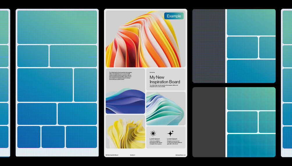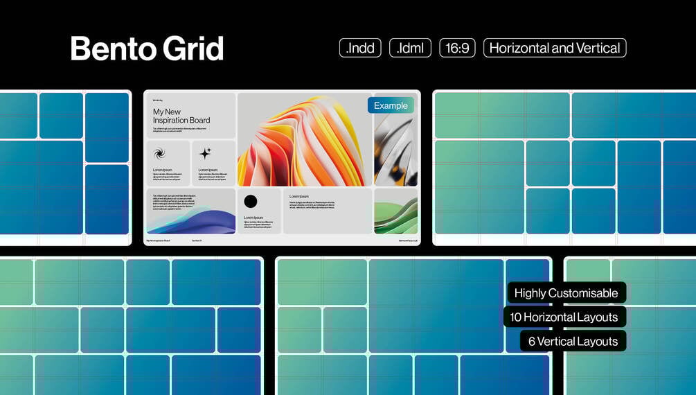 A fully customisable digital 'Bento Grid' layout (Portrait and Landscape) for use within Adobe InDesign.